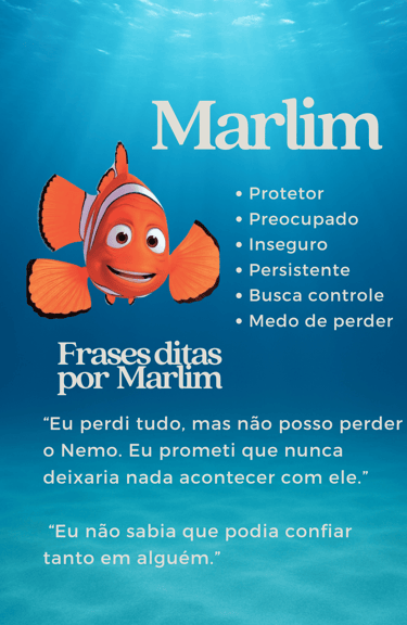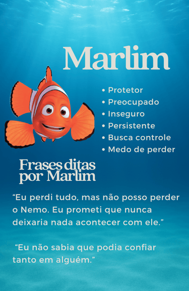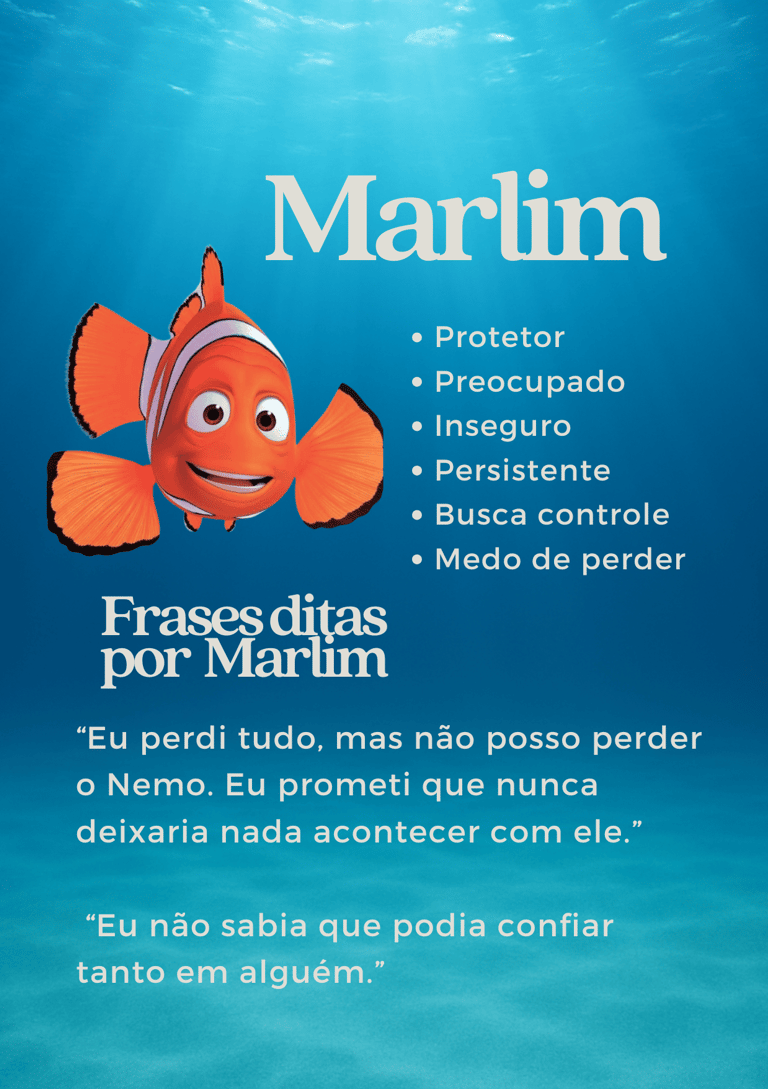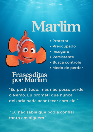 Iremos explorar quais características dos personagens mais tem a ver com você, como a Dory que é otimista e esquecida, o Nemo que é aventureiro e ingênuo e o Marlim que é preocupado e controlador. Você refletirá sobre si a partir deles, em sessão.