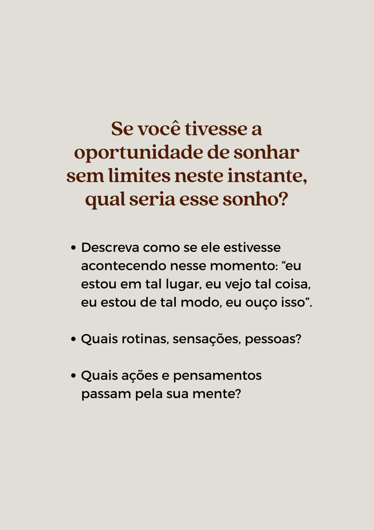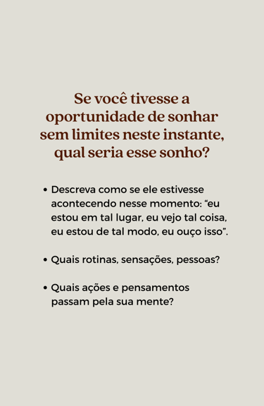 Daremos voz aos seus sonhos e intenções, mapearemos juntos seus valores pessoais, metas e um caminho de ação.